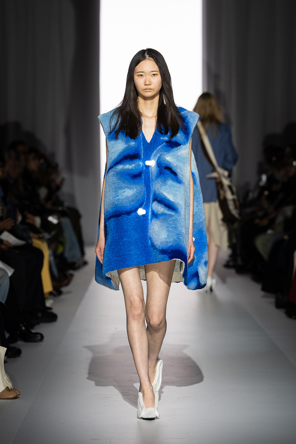 A circular platform resembling an altar was set up on stage, surrounded by a profusion of fluffy flowers. A young girl lay sprawled on the altar as another girl took her hand, attempting to lead her back to the living world. However, to bring her back, they had to adhere to a simple rule: “Never look back.” However, as other models appeared behind them on the runway, the girls simply couldn’t resist the temptation to look behind… Designer Kobayashi noted that the simple phrase “You must not look back” resonated with her brand’s current state. Having continued to present work independently, she has steadily gained a passionate following. One of the brand’s defining characteristics is the intensity and meticulous craftsmanship behind even mass-produced items, all of which are made entirely by hand. Yet beneath that ephemeral cuteness lies an immense amount of effort and perseverance. Through the familiar yusho aesthetic, the brand conveyed a strong resolve: it is not yet time to look back.