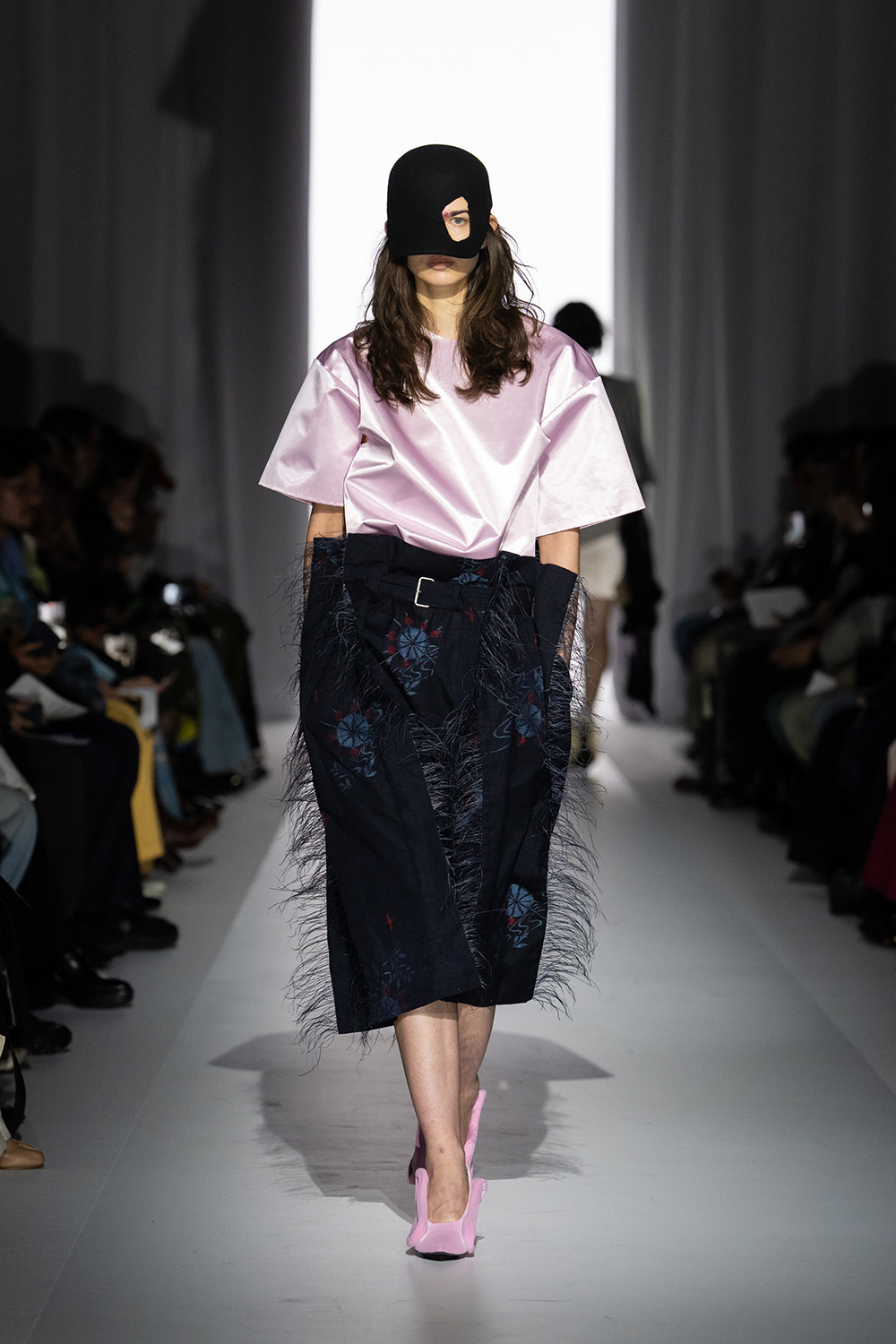 It was not just the sculptural strength of the items; even the sway of the fabric hanging from it conveyd a sense of purpose. One dress born from collaborations with other companies looked as if a sporty raglan-sleeve T-shirt had been flipped upside down and sewn together. Traces of various creators’ works were visible throughout the collection: the “open-eye” cap created in collaboration with Auto Mode Hirata, the platform shoes produced with the shoe brand THREE TREASURES, the knit bag made with Last Frame, and a particular accessory object—distorted glasses reportedly crafted by an assistant.