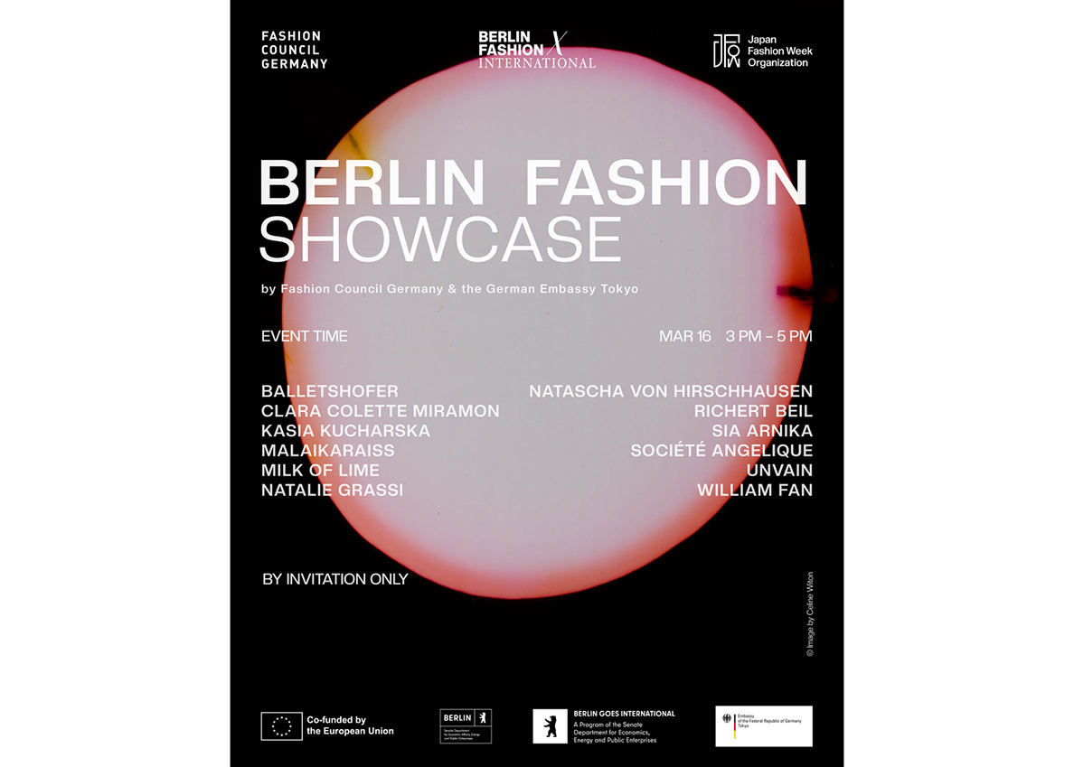 「Berlin Fashion X International」代表団の東京派遣(3月15日〜20日)の一環として、カクテルレセプションをドイツ連邦共和国大使館で開催します。交流とつながりを大切にする本イベントは、ドイツのクラフツマンシップと創造性を間近で体感したり、クリエイションの背景にあるストーリーをデザイナー本人から直接聞くことができるユニークな機会です。会場には、Balletshofer、Clara Colette Miramon、Kasia Kucharska、Malaikaraiss、Milk of Lime、Natalie Grassi、Natascha von Hirschhausen、Richert Beil、Sia Arnika、Société Angelique、Unvain、William Fanという、ベルリンを拠点にする厳選された11ブランドのデザイナーが一堂に会します。